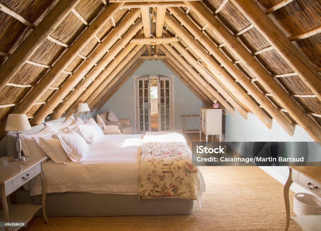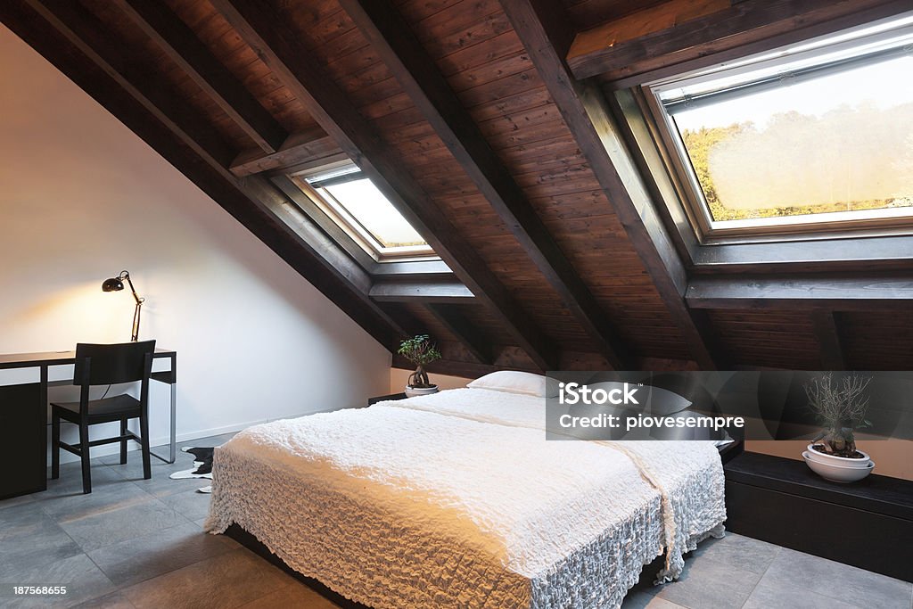 La chambre 2 plus petite, sous combles est chaleureuse et pleine de charme. Le plafond mansardé apporte une atmosphère cosy et intimiste. Un lit double de 160 par 220 cm, confortable. À côté du lit, une table de chevet avec une lampe et quelques objets du quotidien. Une armoire offre un espace de rangement pratique tout en s’adaptant à la pente du toit. L’ensemble crée une chambre fonctionnelle, calme et agréable, idéale pour le repos.